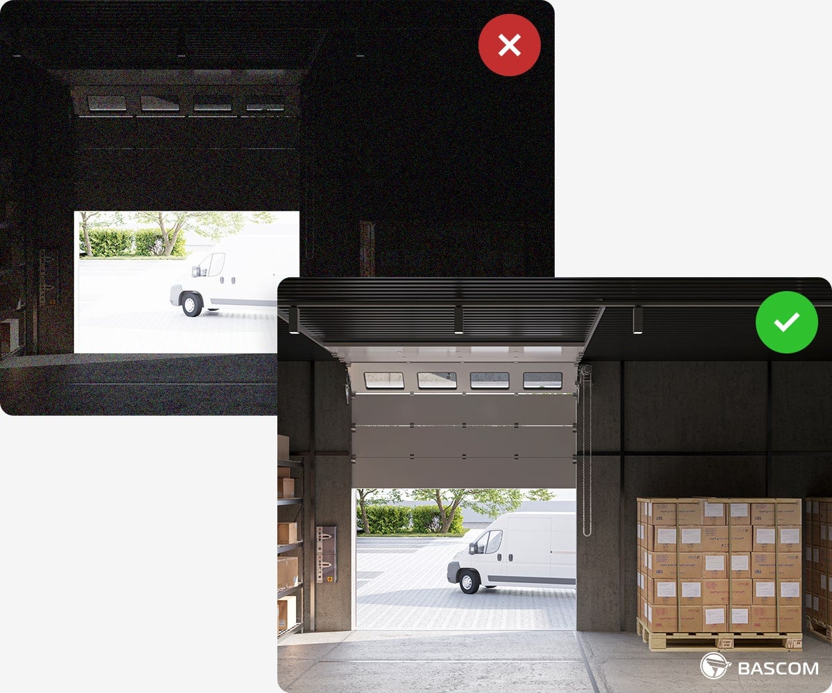Sobald es dunkel wird, schalten die Bascom-PLUS-Kameras in einen Nachtmodus, der die neueste Infrarottechnologie nutzt. Dadurch ist sichergestellt, dass sie selbst bei völliger Dunkelheit – wenn das menschliche Auge nichts mehr erkennen kann – bis zu einer Entfernung von 50 Metern klare Sicht bieten.