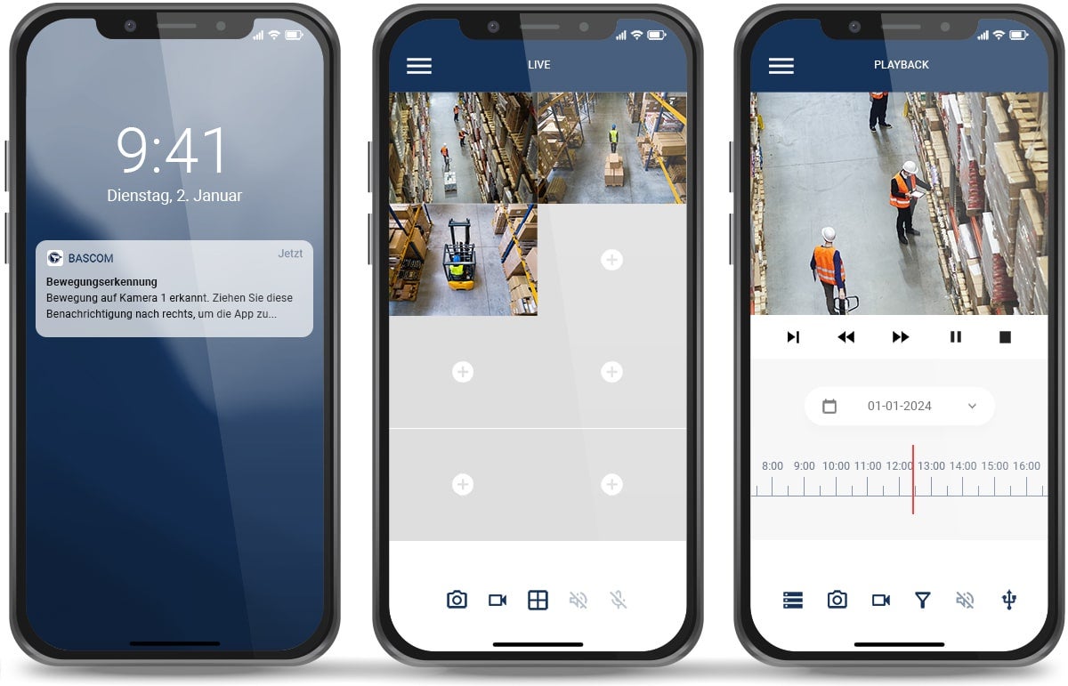 Mit der kostenlosen App von Bascom können Sie von der ganzen Welt aus auf Ihre Kamerabilder zugreifen. Die App ist leicht zu bedienen: Sie scannen den QR-Code auf dem Rekorder und sind sofort verbunden. Anschließend können Sie Live-Bilder sehen, auf Aufzeichnungen zugreifen und Back-ups machen, die Sie direkt auf Ihrem Handy speichern können. Die App unterstützt mehrere Kamerasysteme, die Sie in einer einzigen Übersicht verwalten können.